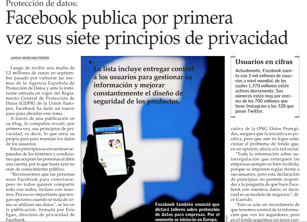 También el diario de circulación Nacional el Mercurio llevó nuestra opinión respecto de los principios de privacidad de Facebook.